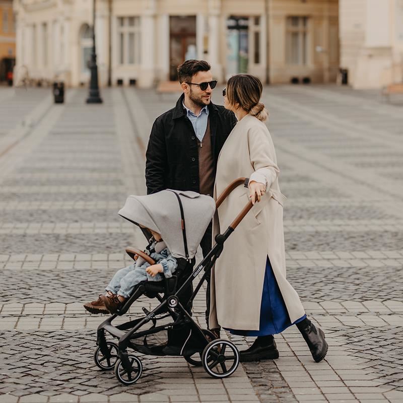 Cadrul caruciorului este realizat din aluminiu anodizat, ceea ce il face rezistent, dar in acelasi timp elegant si cu o greutate redusa, cu frana pe cablu. Beneficiind de un aspect modern, produsul are adaptabilitate intrucat toate componentele se prind pe el in mod facil si intuitiv. Mai mult, ecartamentul rotilor din spate este foarte ingust, astfel caruciorul isi face loc chiar si in cele mai inguste culoare sau ascensoare; sistemul de pliere este usor de utilizat, caruciorul putand fi pliat cu unitatea sport pe cadru, intr-un mod compact care isi gaseste loc chiar si in cele mai mici spatii de depozitare sau poate fi transportat cu usurinta cu ajutorul chingii de transport.