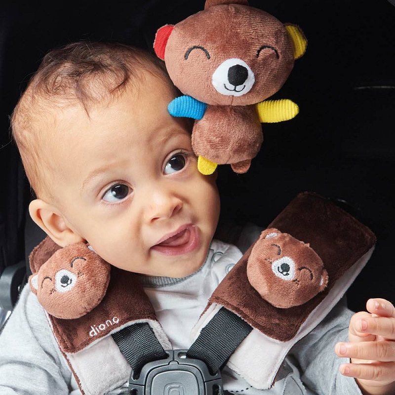 Protectiile pentru centuri Diono Soft Wraps sunt confectionate din catifea moale si confera protectie impotriva iritarii si frecarii produse de centurile de siguranta ale scaunului auto sau ale caruciorului.Protectiile moi sunt decorate cu animale din plus, iar jucaria vibranta multi-senzoriala capteaza atentia celui mic in timpul plimbarii. Agatatoarea tip inel a jucariei are rol senzitiv si de inel pentru dentitie.