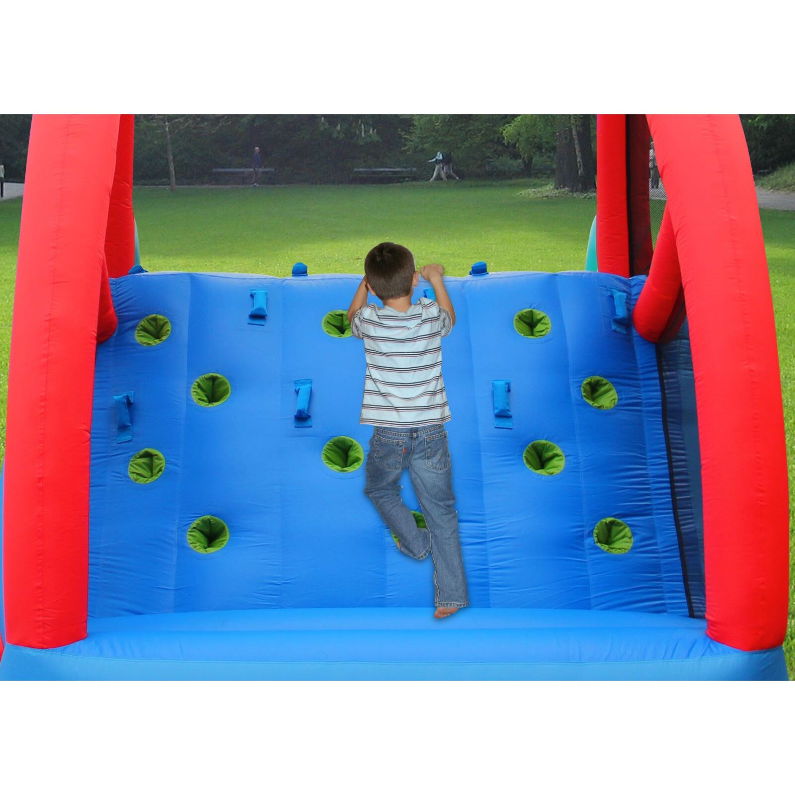 Caracteristici: saltea pentru sarit, plasa de siguranta, spatiu de catarat, tobogan.